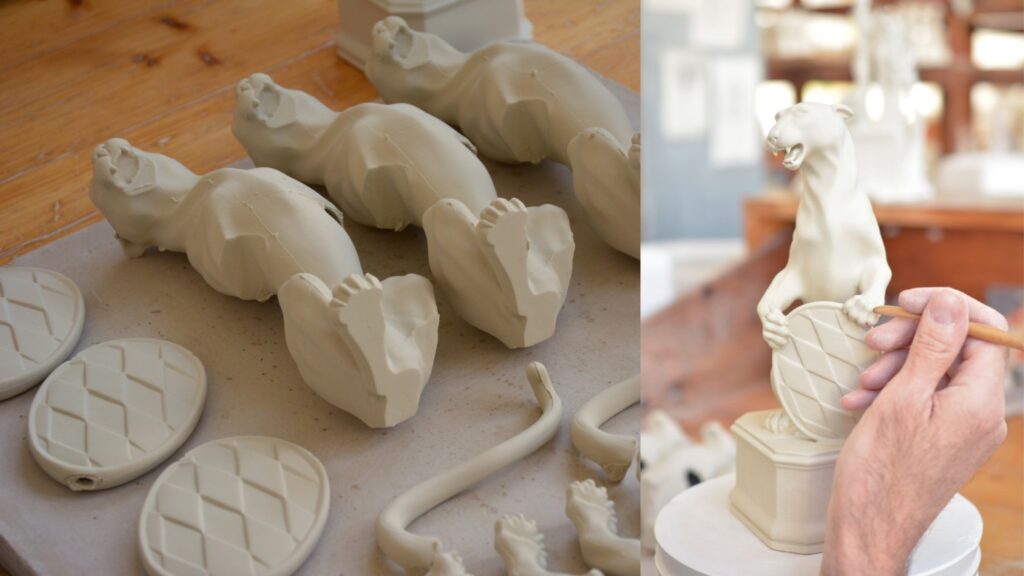 Harding: Ohne eine Gipsform kann man nicht arbeiten. Das sind oft viele verschiedene: Das Ohr ist eine eigene Form, der Sockel oder die Pfoten. Eine Gipsform kann man nur circa 20 Mal verwenden, bis sie keine sauberen Figuren mehr hervorbringt. Die Kollegen in der Formerei gießen die Formen aus und bossieren sie dann in ein Ganzes. Von dort aus geht die Figur in die Hände des Ofenmeisters – der brennt sie ein erstes Mal. Dann wird das Stück händisch glasiert. Der Ofenmeister brennt es erneut, damit es glänzend und erhärtet aus dem Ofen kommt. Es geht weiter zur Qualitätssicherung: Dort schauen die Kollegen, ob alles in Ordnung ist und schleifen die Figur. Dann geht es in die Malerei: Das „Panther-Blau“ muss vor jeder Bemalung neu gemischt werden. Wir haben dafür ein eigenes Labor, das die Farbpigmente so aufbereitet, dass sie keramische Temperaturen aushalten. Die Farbe muss in dünnen Schichten händisch mit einem feinen Pinsel oder einer Feder aufgetragen werden. Danach werden die Figuren nochmal gebrannt – die Farbe wird durch die Hitze fixiert. Die Trophäe kommt nochmal in die Qualitätssicherung und wenn alles gut gegangen ist, kommt sie in die Packerei und darf in ihr schönes Etui.