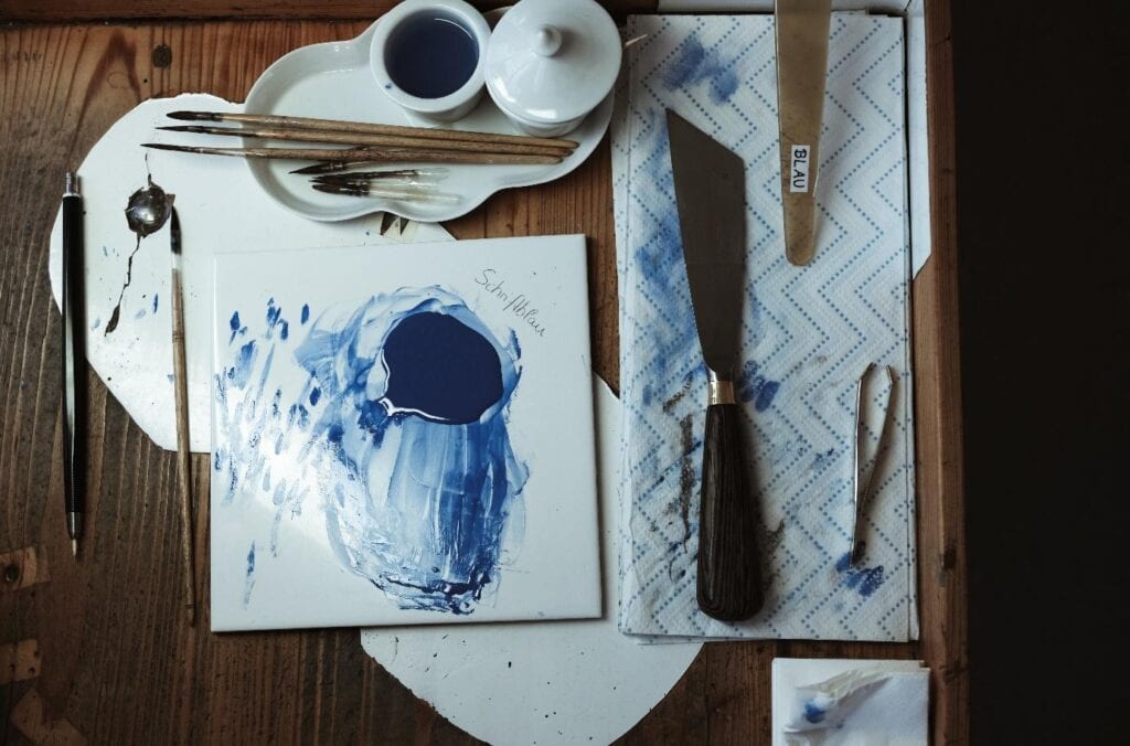 Sobald sie das Farbpulver aus dem hauseigenen Labor erhalten, mischen sich die Porzellanmaler:innen mit Terpentin, Nelken- und Lavendelöl die benötigten Farbabstufungen. (c) Manufaktur Nymphenburg