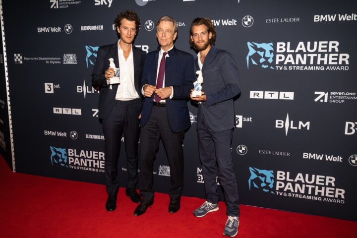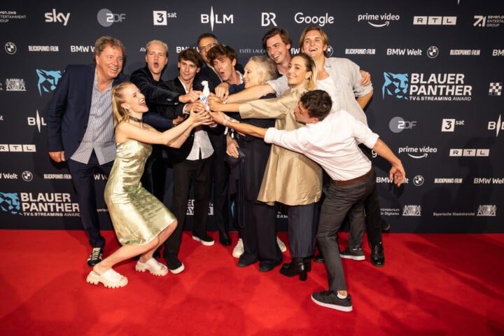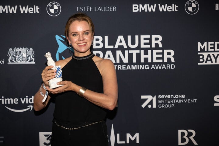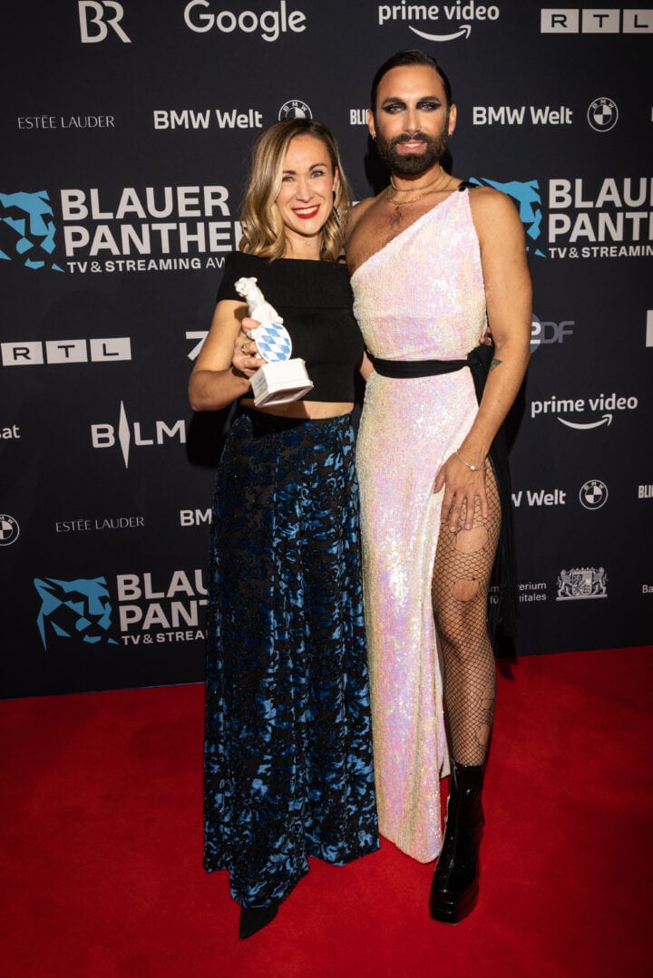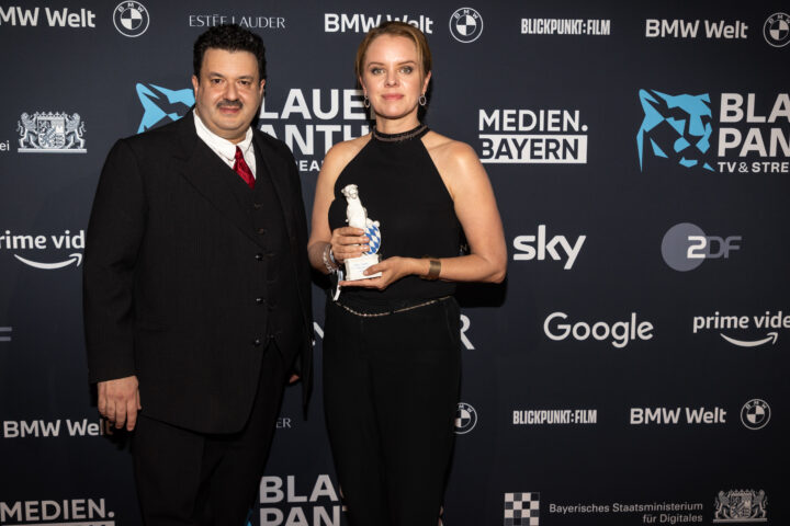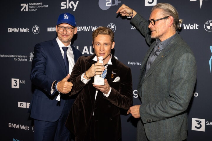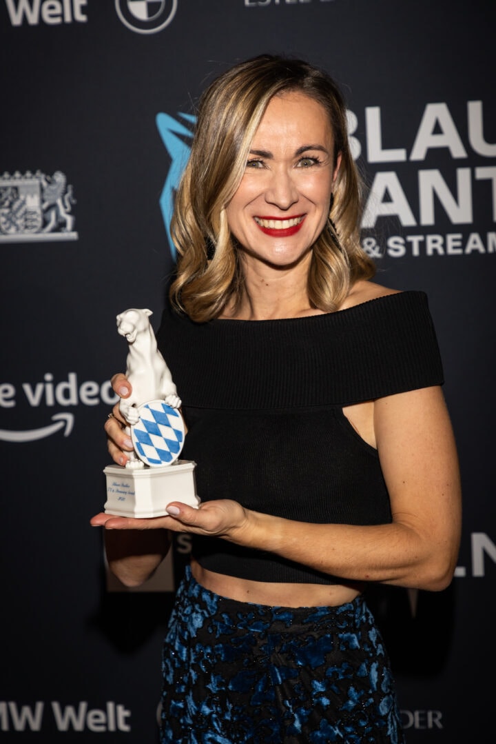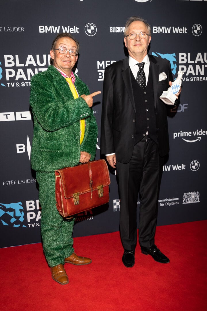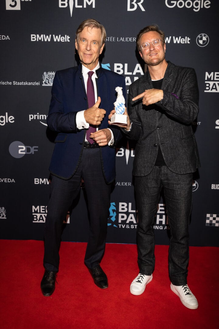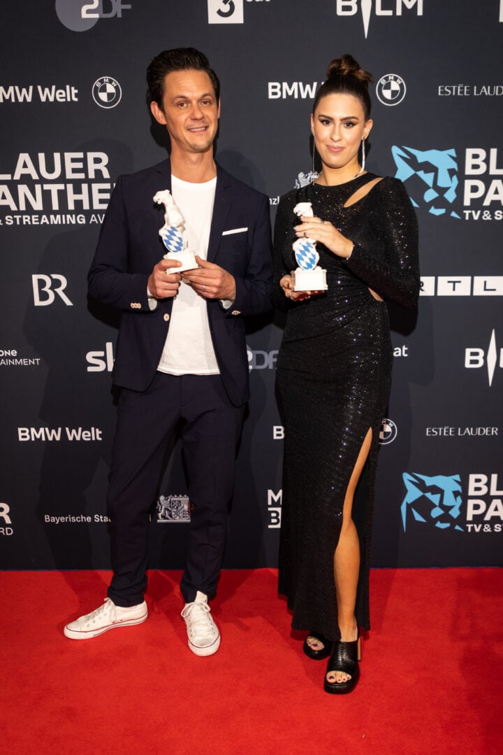 Markus Söder (Ministerpräsident), Judith Gerlach (Staatsministerin für Medien) und Preisträger, Blauer Panther - TV & Streaming Award 2022, BMW Welt, München, 19. Oktober 2022, Foto: Jens Hartmann für Medien.Bayern GmbH